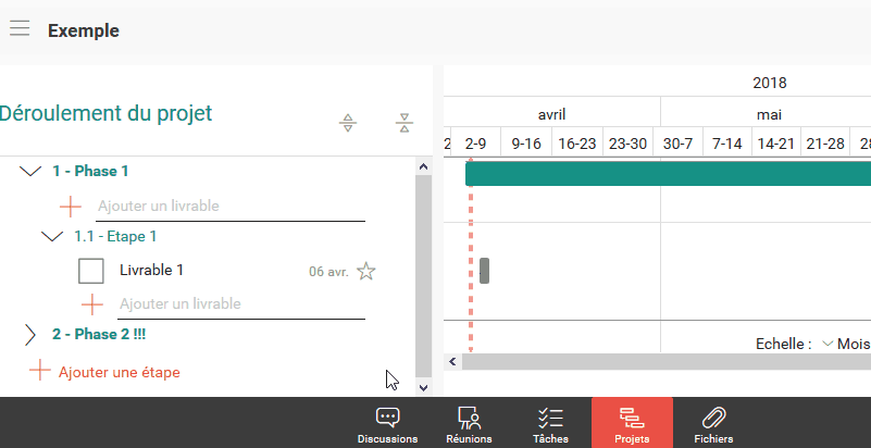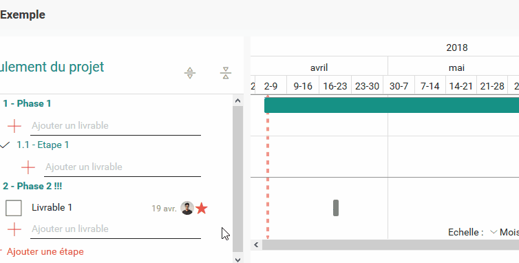 Une fois vos livrables créés, vous pouvez les déplacer pour en modifier l'ordre. Cliquez sur les 4 barres qui apparaîssent sur la gauche du livrable lorsque vous le survolez, maintenez le clic gauche enfoncé et déplacez le livrale à l'endroit souhaité. Si vous désirez faire passer d'une phase/étape à une autre phase/étape, il faut que la phase/étape de destination soit "ouverte".